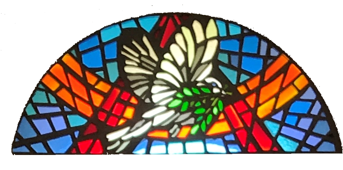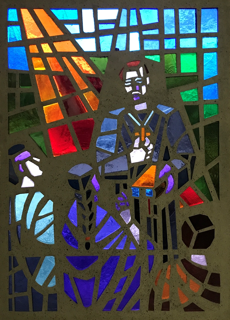 Sur le vitrail les mains du Christ accueillent le Père Tornay et Doci